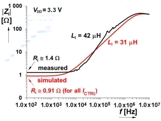 Thanks to the used input stage topology the low input impedance represents an important advantage of this cell. It significantly helps to build current mode application circuits without additional errors or signal distortions. The compared simulation and measurement frequency responses of the input impedance are provided in Figure 15. The input impedance is very low (~1 Ω) at low frequencies. It started to increase above 10 kHz with still nice 18 Ω at 100 kHz. The also mentioned value of the serial inductance Li (the model of the input impedance includes the resistive and inductive parts in series with parallel connection of the input capacitance) gives us the information about the complex frequency response of the input impedance. The cut-off frequency defines the frequency where the input impedance starts to increase significantly with inductive character. For the referred values of the Ri, Li it can be calculated about 5 kHz as it is proved in Figure 15. The parallel capacitance causes the input impedance decrease at high frequencies but above the bandwidth of the presented circuit.