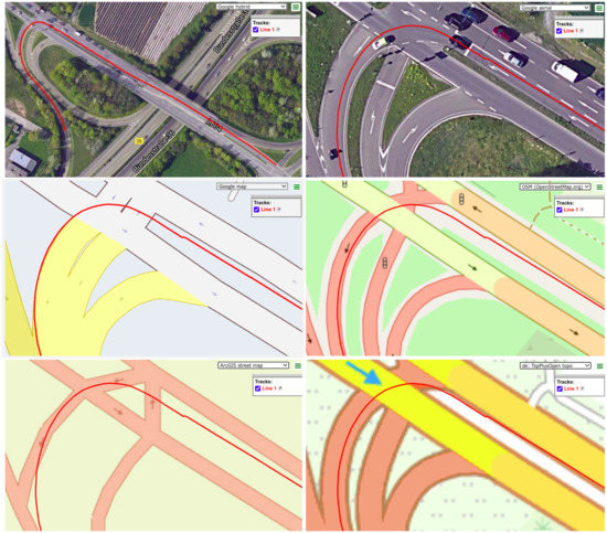 Integrity issues in map sources. Top-left: An example of a GPS track (in red) from the KITTI dataset projected on a satellite map from Google. Top-right: Zoomed aerial view of the track at an intersection. Middle-left: The intersection in a street map from Google. Middle-right: The intersection in a street map from OpenStreetMap. Bottom-left: The intersection in a street map from ArcGIS. Bottom-right: The intersection in a street map from the Federal Agency for Cartography and Geodesy (BKG) of Germany.