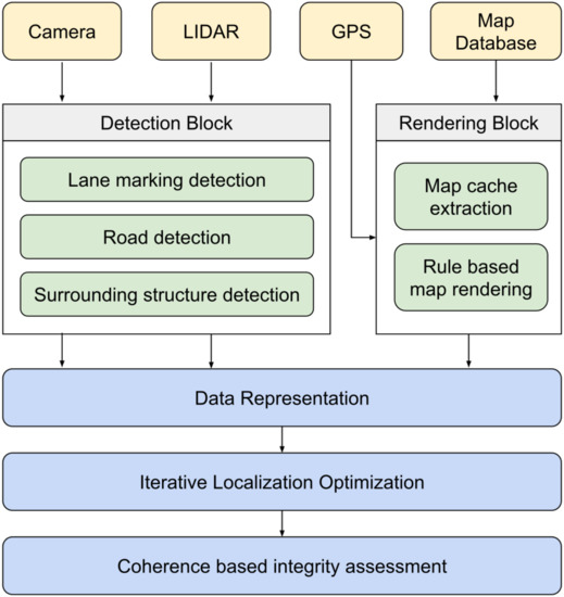 The framework proposed for the integrity assessment developed in this work is given in Figure 2. The Detection Block includes sensor-specific routines to detect features that are relevant to different data fusion algorithms described in Section 2. The Rendering Block uses GPS position to extract data from surrounding map regions and applies rule-based rendering to reconstruct the geometrical structure of the area. The obtained information is represented in a common frame using a common model. In this work, the common reference frame is chosen as the ego frame of the vehicle as the transformations between ego frame, camera frame, LiDAR frame, and GPS frame can be determined by calibration procedures [20]. A decision algorithm is used to decide whether the optimization of localization is required in case of unknown transformations between frames of data and the common reference frame (in our case, map frame to ego frame). Once the required optimization is achieved, coherence between data representations is evaluated and integrity is assessed for each source. In this section, we outline the specific techniques and concepts used in the framework presented in Figure 2.