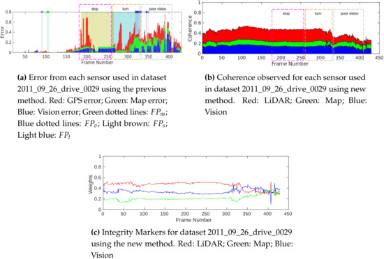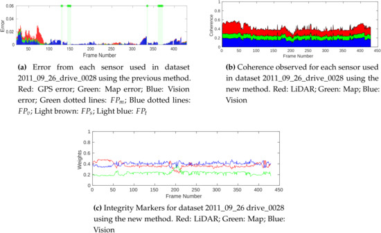 In this section, we compare the results presented in [18] with the results obtained from the new method. The key difference between these two methods is the parameter they use for the integrity computation. The former uses the error observed in model fitting to evaluate integrity, whereas the latter uses coherence between data representations to achieve the same. Hence, the contribution of error by each sensor and the contribution of coherence by each sensor are used for this analysis of the results of these methods, respectively. The same errors are introduced in the GPS for each algorithm, and the results obtained from the dataset 2011_09_26_drive_0029 are shown in Figure 4.