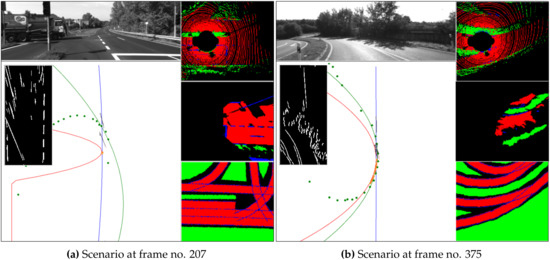 Specific scenarios from dataset 2011_09_26_drive_ 0029. Top left: view of the scenario; bottom left: model fitting; left inset: lane-marking detections; top-right: feature grid (FG) of LiDAR; middle right: FG of vision; bottom right: FG of map.