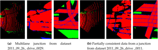 Examples of complex scenarios—cells with road labels(red), lane marking labels (blue), other surface labels (green), unclassified labels (black).