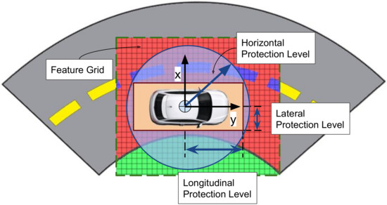 To evaluate and compare the proposed integrity framework to the integrity concepts transposed from civil aviation concepts, the Horizontal Protection Level () is computed. According to [29], the HPL is the radius of a circle in the horizontal plane that describes the region assured to contain the indicated horizontal position. It is the statistical bound for horizontal position error with a confidence level derived from the integrity risk requirement of an application. We also compute the Lateral Protection Level () and Longitudinal Protection Level (), as proposed in [3]. The illustration given in Figure 8 shows the geometrical interpretations of these protection levels with respect to the ego frame of the vehicle and feature grids. Extending these concepts, we use the final distribution of the particles from the localization optimization particle filter described in Section 3.5 to compute , , and . The lateral and longitudinal positions of all the particles that belong to the 95th percentile of the coherence matching scores are modeled using a Gaussian distribution. , , and are then computed using the average standard deviation of particle distributions from each sensor combination used to optimize localization as