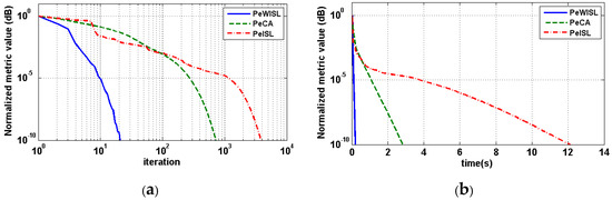 Table 2 lists the iterations and computation times of three methods to generate sequences with three different lengths. All the results in the table are the average values of 100 simulations. The weights of the PeWISL and the PeCA sequences are set as Equation (31). As the sequence length increases, the iterations and computation times of methods increase significantly, except for the PeWISL. It can be seen that the PeWISL consumes the least computation time and the fewest iterations in all three lengths, even compared with the PeCA satisfying the same periodic WISL metric and the PeISL which is also based on the SQUAREM acceleration scheme. Combined Table 2 with Figure 2, we can see that the iteration of PeWISL floats just from 20 to 37 when the length increases from 128 (Figure 2) to 1024. On the contrary, the PeCA and the PeISL consume more iterations which are nearly proportional to the length when . Particularly, the PeISL with consumes iterations and computation time more than . In brief, the relatively stable iteration and less computation time of PeWISL reveal its higher computational efficiency than other methods.