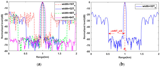 Simulation 1: The weights of the WISL metric in this simulation are set as . The carrier frequency is and the sequence length is fixed to . The stationary target is located 1 km away from the receiver. In this simulation, the coding width of the sequence change by , and respectively, where represents the carrier period. Figure 3a presents the matched filter results versus ranges with different coding widths. With the increasing of coding widths ( denotes a positive integer), the total durations of sequences () increase from 3.2 s (coding width ) to 12.8 s (coding width ). As a result, the length of the optimized range interval also increases, which means the improvement of the ability to detect weak targets in a given range interval. Meanwhile, the increasing of the mainlobe width in Figure 3a means that the range resolution is lowered and results in the difficulty of distinguishing other targets near the main target. This suggests a trade-off between detecting weak targets and distinguishing multi-targets. Theoretically, when the weights are set as , the optimized range interval of a phase-coded sequence with length , carrier frequency and coding width can be represented as follows: