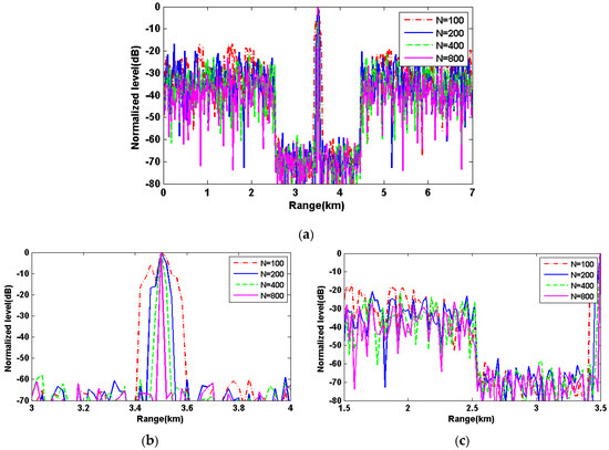 Simulation 2: The carrier frequency is and the sequence duration is fixed to 12.8 s. The weights are the same as simulation 1. The stationary target is located 3.5 km away from the receiver. In this simulation, the sequence length change by , and , respectively. Figure 4 shows the matched filter results versus ranges with different sequence lengths. In Figure 4a, it can be seen that the optimized range interval remains unaltered since the total duration is unchanged. Figure 4b shows that the width of mainlobe decreases as length increases, which results in the enhanced range resolution. Figure 4c shows the details of sidelobes in the range intervals km. As length increases, the average sidelobe levels in the unoptimized range intervals get lowered.