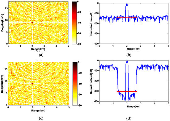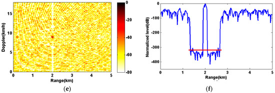 Figure 5 shows the matched filter performance of three sequences. Figure 5a,c,e are the range-Doppler imaging results. All three sequences reach the high resolution in range and Doppler. For the PeISL (PeCAN) of Figure 5a, there are two low sidelobe intervals across the true target position. By contrast, the PeCA in Figure 5c and the PeWISL in Figure 5e show the short interval of low sidelobes and the same sharpness of the target ‘lightspot’. Since the PeCA and the PeWISL only focus on the reduction of sidelobes in time domain, it is reasonable that there is no difference between the match filter results versus Doppler of three methods. For simplicity, we only present the match filter results versus range in Figure 5b,d,f. In Figure 5f, the average sidelobe level of PeWISL in the whole range interval is −130.09 dB which is between −143.47 dB of PeISL (PeCAN) in Figure 5b and −118.26 dB of PeCA in Figure 5d. On the contrary, the average sidelobe level of the PeWISL in the optimized range interval is suppressed to −318.01 dB (the solid red line in Figure 5f), which is the lowest compared with the PeISL (PeCAN) (−132.90 dB) and the PeCA (−304.77 dB). The results indicate that the PeWISL sequence sacrifices the average ISL in the whole range interval for the lowest sidelobe levels in the optimized interval. This also demonstrates that among the methods optimizing the periodic WISL metric, the PeWISL reaches the better matched filter performance than the PeCA.