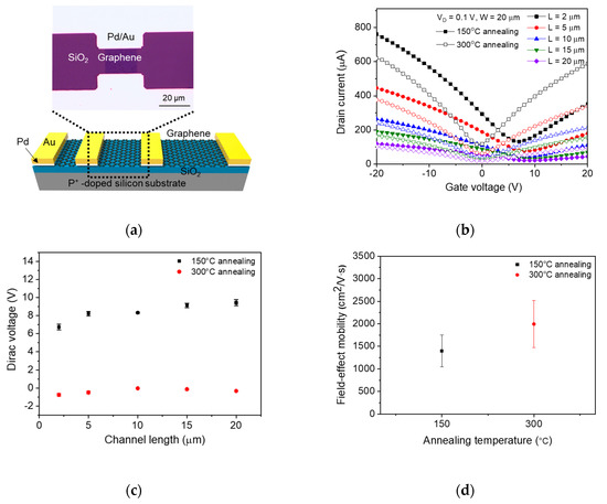 (a) Schematic and optical image of the field-effect transistor (FET)-structure graphene photodetector. (b) Two sets of transfer characteristics (ID–VG) of the graphene photodetectors measured at VD = 0.1 V after 150 °C and 300 °C annealing. Channel lengths varied from 2–20 μm, and channel width was fixed to 20 μm. The error bar indicates a standard deviation. (c) Dirac voltage vs. channel length of the graphene photodetectors extracted from the ID–VG characteristics measured after 150 °C and 300 °C annealing. (d) Field-effect mobility of the graphene photodetectors after the post-annealing process. The mobility values were calculated using the maximum transconductance values and conventional field-effect mobility equation [27].