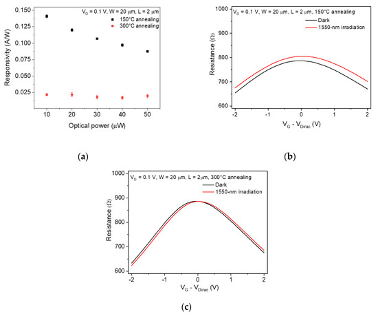 (a) Responsivity of the graphene photodetectors with the channel length of 2 μm as a function of optical power after annealing at 150 °C and 300 °C. The error bar indicates a standard deviation. Total device resistance of the graphene photodetector as a function of gate bias measured after (b) 150 °C and (c) 300 °C annealing under dark and illuminated condition.