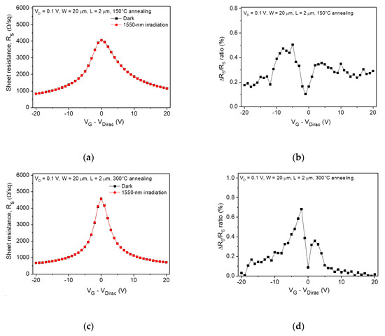 From the electrical measurements (Figure 1b,c), we estimated that the channel graphene was slightly n-type doped after 300 °C annealing. The junction barrier height between the channel and contact graphene was relatively lower than that of the graphene photodetector after 150 °C annealing because the doping level difference was very small, as shown in the inset of Figure 4d. Photogenerated carriers recombine right away due to the short lifetime of graphene [32,33]. As we expected, the field-effect mobility of graphene was not significantly changed from 1170 (under dark) to 1160 cm2/V∙s (under light illumination) after 300 °C annealing.