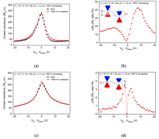 Contact resistance as a function of gate bias extracted from the total device resistance measured after (a) 150 °C and (c) 300 °C annealing under dark and illuminated conditions. (b), (d) The change ratio in the contact resistance as a function of gate bias calculated from (a) and (c), respectively. Inset: band diagrams in the junction between the channel graphene (left) and graphene near the metal contact (right). The Fermi energy level (EF) and graphene Dirac point energy level (E’F) are illustrated by the dashed and solid lines, respectively.