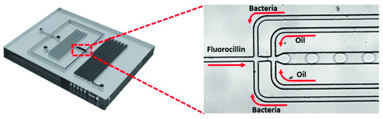 The pattern of the microchannel (width: 10–200 µm, depth: 20–50 µm) was designed in AutoCAD and printed on high-resolution film masks by CAD/Art Services (Bandon, OR, USA). Two aqueous inlets are used to deliver the Fluorocillin sensors and the bacteria sample to the microfluidic channels separately to minimize the reaction before the droplet formation. The channel design was transferred to 4-inch silicon wafers by the standard photolithography procedure, which follows. The wafers were briefly rinsed with 5% hydrofluoric acid (Sigma-Aldrich, St. Louis, MO, USA) and deionized (DI) water. Before spin coating (6NPP-LITE, Laurell Technologies Corporation, North Wales, PA, USA), wafers were dehydrated in an oven at 95 °C for 10 min. Then, negative photoresist (approximately 3 g, SU-8 50, MicroChem, Chestech, UK) was spin-coated (500 rpm for 10 s, then 3000 rpm for 30 s) onto the wafer. Then, the SU-8 layer was cured on a hotplate at 65 °C for 5 min and at 95 °C for 30 min. Then, the cured SU-8 layer was exposed to UV radiation (14 s, 20 mW/cm2, AB&M INC UV Flood Exposure System) through the photomask, and the wafer was subsequently post-baked for 1 min (65 °C) and 5 min (95 °C). Unexposed SU-8 was removed by soaking in SU-8 developer for 5 min. Then, the wafer was cleaned using isopropyl alcohol, blow-dried with filtered nitrogen gas, and silanized with perfluorooctyl-trichlorosilane (Sigma-Aldrich, St. Louis, MO, USA) under vacuum for 3 h.