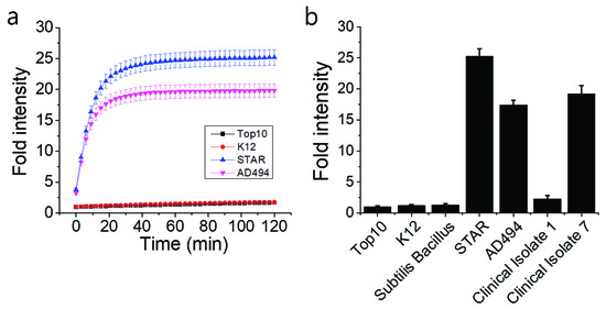 The functionality of the Fluorocillin sensor was verified in terms of the detection of β-lactamase-production from bacteria with the 96-well microplate reader. Genetically engineered ampicillin-resistant Escherichia coli (E. coli), the STAR and the AD494 strains, produce β-lactamase and were used as a known positive control. The fluorescence intensity was generated from the β-lactamase-initiated cleavage of Fluorocillin, which was saturated for 30 min after both STAR and AD494 strains were exposed to the substrate (Figure 4a). In this study, two types of clinical isolates were also tested, and strong fluorescence intensity was observed with clinical isolate 7, which is the ampicillin-resistant strain (Figure 4b), but the ampicillin-susceptible strain (Clinical Isolate 1) showed very weak fluorescence intensity. None of the ampicillin-susceptible strains (Top10, K12, Bacillus subtillis, and Clinical Isolate 1) showed any strong fluorescence signals.
