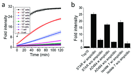 The presence of ampicillin in the culture also had a positive impact on enhancing the signal intensity (Figure 5b). Three different bacteria strains were pre-cultured with or without ampicillin to investigate the difference of β-lactamase production. Each strain was loaded at a cell number of 1×107, and fluorescence intensity was monitored after 120 min, with the Top10 ampicillin-susceptible strain serving as a negative control. As shown in Figure 5b, ampicillin co-culture increased β-lactamase production because it modulates the capacity of β-lactamase production, and fluorescence intensity was identified as 4.35, 4.04 and 5.71-fold higher in the STAR, AD494, and isolate 7 strains, respectively.