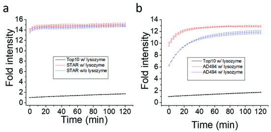 β-lactamase is synthesized inside bacteria and secreted, which resulted in exposure to the Fluorocillin sensor. It was believed that bacterial lysis may induce or increase the sensitivity of β-lactamases detection with Fluorocillin. To investigate the effect of cell lysis, Fluorocillin and 1 × 106 bacterial cells were incubated with or without lysozyme (Figure 6). Once bacterial cells were lysed with lysozyme, fluorescence intensity saturated more quickly compared to non-lysed cells, using the AD494 strain for the comparison. However, the STAR cell line only showed minor improvement, while the AD494 cell line showed aggressive improvements at the starting point of the experiment. This result suggests that the cell membrane of STAR stain may be more resistant against lysozyme.