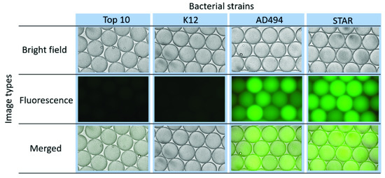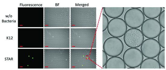 Since each droplet can serve as an isolated bacterial culture, bacterial cells and the Fluorocillin sensor were co-encapsulated within microdroplets using a droplet-based microfluidic device, as shown in Figure 2. To ensure that the reaction verified in the bulk study can be repeated in droplets, bacterial cells were cultured in bulk with ampicillin-containing LB, and a relatively high number of bacterial cells (2 × 109 bacterial cells per mL) were used for encapsulation within 50 µm in diameter droplets. Based on the calculation, the volume of the droplets is approximately 65 pL in volume, and 65 bacterial cells were encapsulated per droplet. The resistant strains AD494 and STAR showed strong fluorescence under the fluorescent microscope (Figure 7) and fluorescence intensity among different droplets varied, which may be caused by the deviations of bacterial numbers being captured by every individual droplet during droplet generation. The ampicillin-susceptible strains did not show any significant signals but only some weak background noise from the unreacted Fluorocillin.