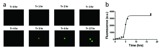 In optimal conditions, E. coli divides roughly every 20 min, and so after 5 h, there are expected to be 32,768 bacteria formed from a single bacterium in a droplet. Signals are detectable under a fluorescent microscope after 5 h of culturing at 37 °C (Figure 9). The optical detector of the microscope is a CMOS (Complementary metal–oxide–semiconductor) camera array that converts the green fluorescent emission into a photocurrent. The PMT in the IC 3D system was more sensitive than the CMOS camera found in commercial microscopes. Therefore, we expected that a 5-h culture will give a strong enough fluorescent signal for detection by the IC 3D system.