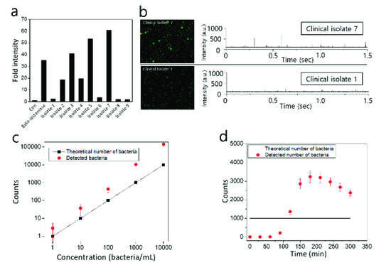 More recently, nano- and micro-based systems have been developed such as Droplet Digital PCR (ddPCR) [9,10,11], which involves the partitioning of the sample into thousands or millions of droplets, followed by separate PCR reactions occurring within each individual droplet. The number of DNA copies contained in each droplet can be predicted by the Poisson distribution [12]. Samples with low target concentrations can be partitioned into millions of nanoliter-sized droplets with a low probability that any droplet will contain more than one target. Once the reaction is complete, the positive droplets will fluoresce, which allows for counting by a flow cytometer to determine the number of positive droplets with single-digit sensitivity. Compared to traditional qPCR, ddPCR can improve detection sensitivity and selectivity but typically is limited to small sample volume (μLs), which cannot handle the required clinical sample volume (mLs of blood) and throughput, as bacteria in patient samples may be present at single-digit CFU levels. These conventional methods tend to require expensive equipment and complex sample processing steps (e.g., cell lysis, nucleic acid extraction, amplification of signal) to purify and enrich the target, resulting in significant target loss when there are only a low number of targets present in the sample [13].