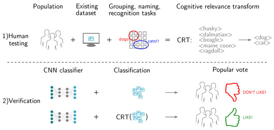 | The Cognitive Relevance Transform (CRT) is a sequence of operations in image categories. The CRT is obtained in three steps. First (operation 1), the dataset is subsampled by Algorithm 2. Second (operation 2), user studies are performed (see Section 3.2 and Algorithm 3). Third (operation 3), merging operations E and separation operations S are determined by Algorithm 4. Renaming operations R are determined by Algorithm 5. = denotes definition and ← denotes calculation. |