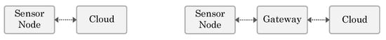 An IoT-based parking system can be structured in multiple hierarchical levels, each of which serves a specific purpose. Typically, such a system senses the environment and/or actuates at the lowest level of the hierarchy. Shown in Figure 2, the sensor node is usually directly connected to the Cloud for data transfer, or, is connected to a nearby local gateway or server which enables data pass-through to the Internet and finally to applications located at the Cloud. A fast communication from the nodes to all the way up to the Cloud can result in a near real-time application experience. This is observed in recent years [23] and it works well for single node setup. However, as the number of nodes increases and ubiquitous sensor data becomes essential for IoT-based parking systems, the performance of this approach starts to deteriorate. Correspondingly, the reliability of the system can diminish and cost of maintenance may increase, especially in application scenarios in which real-time monitoring and control are of utmost importance.