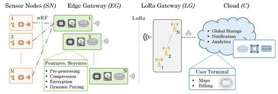 To ensure real-time parking space monitoring and control, the existing and most commonly used Sensor-node-to-Cloud hierarchical approach needs to be improved by integrating high computation-capable computers or gateways working at the edge layer in the existing system. This would improve the overall performance and manageability, while effectively reducing operational latency and cost. In addition, by using LoRa communication technology where data is not required to transfer frequently and in high volumes, the cost of network coverage and infrastructure can be significantly lowered. Figure 3 illustrates our proposed system architecture that can be used to implement the typical parking scenario depicted in Figure 1. Our proposed system consists of four layers: a sensor node layer (SN), an edge gateway layer (EG), a LoRa gateway layer (LG) and a cloud layer (C). These layers and their corresponding functionalities are described as follows.