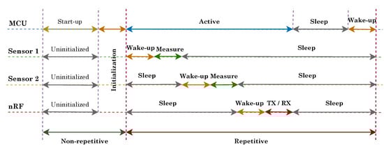 To save energy, a greedy approach is applied in the sensor node to maximize the time in sleep mode and complete other operations such as measurement and data processing within shortest possible time. The operational time-line is shown in Figure 5. Essentially, the time-line is divided into two parts: a one-time non-recurring part which consists of start-up routines and initialization of sensors and communication module, and a recurring one which contains measurement, data processing, data transmission and sleep operation. The sleep duration in the latter part depends on the frequency (e.g., once every 10 s) at which the parking slot needs to be monitored for a parked vehicle. To achieve maximum battery life, all of the components including the MCU are kept in sleep mode for most of the time during operation and are only activated for the duration when required.