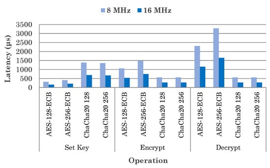To secure the collected data from these sensor nodes before sending it upwards to an edge gateway, a suitable encryption is applied based on the operation mode. For instance, the AES [44] block cipher is used when only a single data collection is performed, while ChaCha [45] stream cipher is better when streaming continuously. As ChaCha is optimized for streaming data and has lower latency than AES, it is more suitable for the limited-resource MCU used sensor nodes. We used the Arduino Crypto library [46] to implement these cryptography algorithms in our sensor node. Figure 6 shows comparison of the operational latency in different operations of encryption process between the two algorithms when varying key sizes at different MCU clock frequency. Consequently, this approach also reduces energy consumption and helps to achieve longer sensor node battery life.