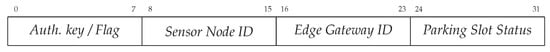 As the edge gateway analyzes, processes, and extracts required information from the raw data collected from the sensor nodes, an encrypted summarized status of the parking slots is sent to a LoRa gateway. A simplified data packet payload structure comprising of 4 bytes is shown in Figure 7. For example, if 50 sensor nodes are connected to an edge gateway, 200 bytes of total data can be transferred to a LoRa gateway once every 31 s with 125 kHz bandwidth, spreading factor 7, a preamble of 8 bytes, coding rate of 1.25 and CRC checks. However, due to the implemented compression, the actual number of transferable bytes is lower than the calculated one.