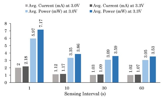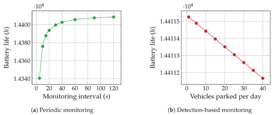 The energy consumption of our sensor node with different sensing intervals is shown in Figure 8. The measurements show average current and average power consumed when 3.0 V and 3.3 V voltage supply was used as the power supply. It can be observed that the overall energy requirement of the prototype sensor node is low because both the MCU and sensor nodes use low-power sleep mode. Among the test configurations, the lowest average current and average power are achieved at 3.0 V when vehicle detection is performed once every minute. This translates to an operating life of more than 1 year and 8 months with a 10,000 mAh battery when it works 24/7. However, if we switch to vehicle-detection-based transmission mode, lower number of transmissions occurs, and thus we can achieve a higher battery life compared to periodic vehicle monitoring mode, especially during the off-peak hours. Figure 9 shows how battery life is affected when a sensor node is run in these two modes: Figure 9a shows battery life for monitoring interval in seconds and Figure 9b for varying number of vehicles parked in a day. It is noticeable that in the periodic monitoring mode, the battery life can have higher variation depending on the monitoring interval. When calculating the battery life of the parking sensor node, a nominal 1% monthly battery self-discharge rate is used. Since the parking sensor node is mostly kept in sleep mode, the battery has enough time to recover the capacity lost due to switching from sleep to active mode [53].
