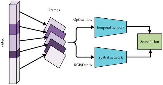 Generally, the actions in a video are understood in two ways. One is to extract spatial information from video frames, and the other is to obtain temporal information from the context of video frames. Based on this point, Simonyan et al. [14] proposed a two-stream network that uses temporal and spatial networks to recognize actions. The temporal network is used to extract the action information in the video, and the spatial network is employed to obtain information such as the position, shape, and structure of the object. In a TSN, the network achieves optimal performance when an Inception architecture with Batch Normalization (BN-Inception) is applied to both the spatial and temporal streams at the same time.