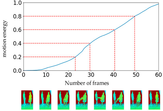 The total motion energy of the video is represented by . According to Equation (2), denotes the normalized motion energy. The motion energy accumulation of a kicking action video is shown in Figure 2.
