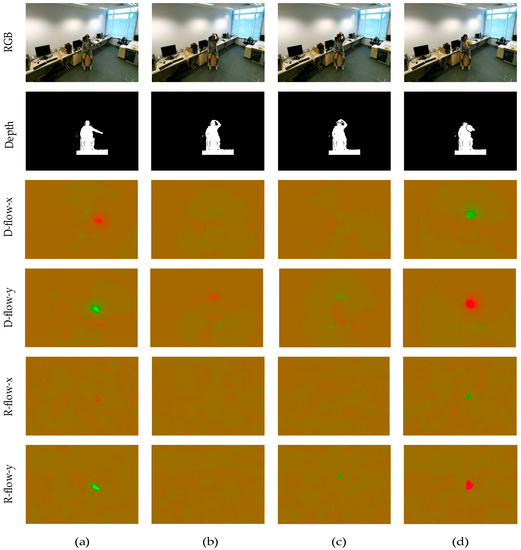After quantizing the depth video, the optical flow was calculated by using the total variation (TV) regularization and the robust L1 norm (TV-L1) optical flow extraction algorithm found in [30]. The difference in the pixel value range of different datasets was caused by the difference in the sensitivity of the depth sensor, but it is quantified to the same range before the optical flow is extracted in our method. Therefore, this deep optical flow extraction method is accessible for other datasets. The optical flow extracted from RGB is denoted as R-flow, while the optical flow extracted from depth is denoted as D-flow. Taking the action of removing the hat as an example, Figure 3 lists a partial frame diagram of the four-modal data of RGB, depth binarization, R-flow, and D-flow. For the sake of clarity, the images of two optical flows were processed with pseudo color. It can be seen from Figure 3 that D-flow was similar to R-flow in the x and y directions, and the effectiveness of D-flow in multimodal action recognition was seen in experimental results.