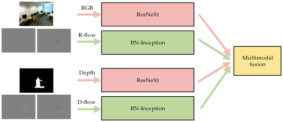 However, it is known that the observation and recognition of target shapes and actions are two completely different processes. Therefore, an appropriate network structure for temporal and spatial networks should be designed independently. Previous studies [21,32] have shown that a convolutional neural network with more layers can extract more features and high-level semantic information than a basic network. Nevertheless, as the number of layers increases, the network performance degrades. As a result, the problems of gradient disappearance and gradient explosion may occur, which limits the application of BN-Inception. The outline of the network structure of BN-Inception can be found in Figure 5 of [33]. The proposed Residual Network (ResNet) [21] solves the problems of network degradation and gradient disappearance, and it enables the network to be continuously deepened. The outline of the network structure of ResNet can be found in Figure 3 of [21]. Xie et al. [22] proposed a more excellent ResNeXt network based on ResNet. Even with the same number of convolutional layers, ResNeXt has better performance and fewer parameters than ResNet. The outline of the network structure of ResNeXt can be found in Figure 1 of [22]. According to experimental results in Section 4.3.2, ResNeXt was selected as the convolution architecture of the spatial networks and BN-Inception was chosen as the convolution architecture of the temporal networks. The spatial stream networks deal with RGB and depth data separately, while the temporal stream networks process R-flow and D-flow data separately. In the course of multimodal weighted fusion, the video data of each modality are sent to the trained network to obtain the initial motion classification. Then, a certain weighting coefficient is assigned to the action classification score of each modality before the weighted fusion of the multimodal data classification results is performed. Meanwhile, the optimal weighting factor is obtained by a traversal search. The fusion weights are determined by the data distribution of different datasets. Therefore, the optimal weight obtained is the optimal value on this dataset. Our multimodal heterogeneous networks are shown in Figure 5.