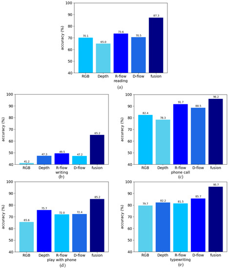 In addition, from the experimental results, it could be seen that the complementary multimodal data could improve the misjudgment of similar actions. Figure 7 lists the results of the improved recognition performance of multimodal fusion on several similar actions in the NTU RGB+D dataset (such as reading, writing, making phone calls, playing with a phone, and typewriting). This similarity action was embodied by the spatial and temporal domains. In the spatial domain, the relative positions in different actions between the actors and objects were similar to each other, and the appearance of the action was similar to other actions as well. In the temporal domain, the long-lasting states of different actions were similar. For example, writing and playing with a phone were in the same motion state for a long time, so they were prone to being misjudged as each other. The actions of putting on a coat and taking off a coat in the dataset were very similar in the spatial domain, but there was a sequential relation of the actions in the temporal domain. Thus, they could be easily distinguished by heterogeneous networks. In Figure 7, the recognition accuracy from low to high is represented by color from light to deep. Reading and writing were similar actions, and it was easy for them to be misjudged as each other. From Figure 7, it can be seen that multimodal fusion improved the recognition accuracy of these two actions by 10–24%. For several other similar actions, the recognition accuracy also increased by more than 10%. The experimental results validated the performance of our multimodal fusion strategy.
