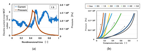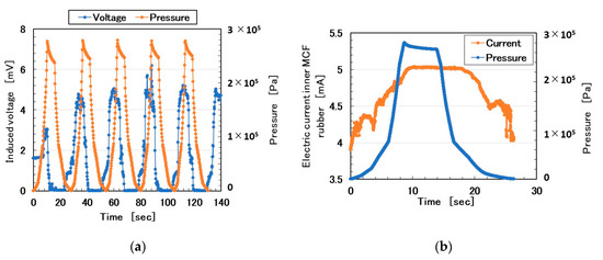 The MCF rubber sensor was produced using the proposed consummate fabrication process [1]. “Adhesive MCF rubber 2” consisted of 0.5 g of Na2WO4·2H2O, 3 g of water, 0.75 g of MF (W40, Ichinen-Chemicals Co., Ltd., Shibaura, Japan), 3 g of KE1300T (Shin-Etsu Chemical Co. Ltd., Tokyo, Japan), 3 g of PVA, 3 g of NR-latex (Ulacol, Rejitex Co. Ltd., Atsugi, Japan), 3 g of CR-latex (671A, Showa Denko Co. Ltd., Tokyo, Japan), 3 g of TiO2 (Anatase type, Fujifilm Wako Pure Chemical Co., Ltd., Osaka, Japan), and 3 g of Ni. “Porous MCF rubber 1” consisted of 0.5 g of Na2WO4·2H2O, 3 g of water, 0.75 g of MF, 3 g of KE1300T, 3 g of NR-latex (Ulacol), 3 g of CR-latex (671A), 3 g of TiO2, and 3 g of Ni. It was permeated with glycerin. “MCF rubber 3” consisted of 0.75 g of MF, 3 g of NR-latex (Ulacol), 3 g of CR-latex (671A), 3 g of TiO2, and 3 g of Ni. Here, we used KE1300T instead of the KF96 in the figure of the proposed consummate fabrication process shown in [1]. The MCF rubber liquid was electrolytically polymerized, whereby a static magnetic field of 312 mT was applied to a pair of two stainless electrodes with a 1-mm gap using permanent magnets as paired opposites via the application of a constant electric field at 2.7 A. The Ni powder had particles in the order of microns and bumps on the surface (No. 123 by Yamaishi Co. Ltd., Noda, Japan). The MF used was 40 wt% Fe3O4. The MCF rubber sensor produced in this study was the same as that in the previous one [1]. Figure 1a shows the induced voltage as piezo-electricity in response to the repeating pressure and Figure 1b the electric current as piezo-resistivity in response to a pressure. For the former, as the pressure increased, the induced voltage increased and subsequently decreased to zero. This tendency can be explained by the fact that, as the counter negative and active ions become closer, the induced voltage increases. As the pressure increases, the counter ions come into contact and this phenomenon has previously been clarified [17]. In contrast, for the latter, because the outer Q rubber acted as a buffer to the applied pressure, the electric current reacted slightly later than the pressure, which was a peculiar property. Regardless of the Q rubber buffer, the MCF rubber sensor is attractive to the normal force.