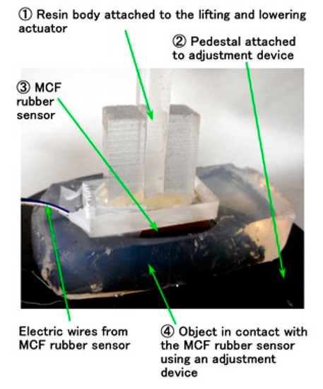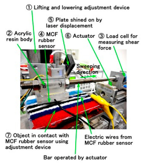 Figure B shows the experimental apparatus used to measure the electric current, voltage, or electric resistance between the opposing electrodes at the application of a shear force to the MCF rubber; this experiment is called SFE [20]. This was accomplished using an electric power supply of 10 V and an electric resistance of 1.8 kΩ. The MCF rubber sensor was placed under an acrylic resin body on which two electrodes of the stainless plate were attached. The MCF rubber sensor contacted a rubbing object and was moved parallel to the object surface by an actuator at a speed and a sweeping distance of 50 mm.