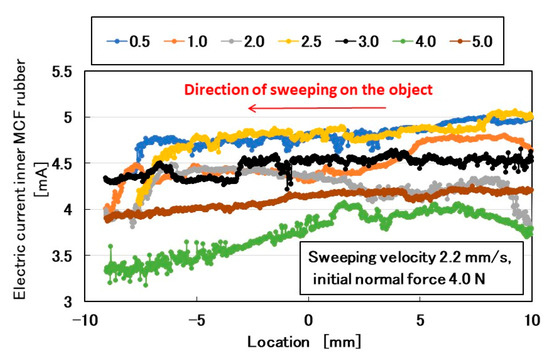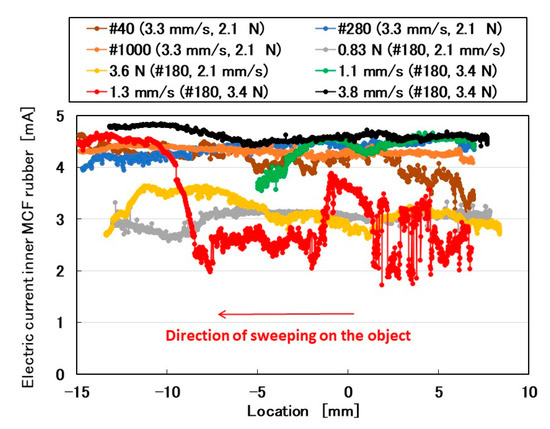Initially, the rubbed object was sandpaper that was attached to a flat plate with a rough surface. The sandpaper was prepared with various values of surface roughness and was optimal for investigating the effect of surface roughness on the MCF rubber sensor. The electric current of the MCF rubber sensor is shown in Figure 3. The MCF rubber sensor moved from a positive location to a negative one (from right to left). Using a surface roughness measuring device (SJ-400, Mitutoyo, Co. Ltd., Kawasaki, Japan), we observed that #40 sandpaper had 56.2 μm Ra, 216.7 μm Ry, and 68.2 μm Rq; #180 sandpaper had 14.1 μm Ra, 74.4 μm Ry, and 17.2 μm Rq; #280 sandpaper had 9.75 μm Ra, 55.8 μm Ry, and 12.6 μm Rq; and #1000 sandpaper had 3.32 μm Ra, 21.6 μm Ry, and 4.1 μm Rq. When the roughness curve represents z(x), the arithmetic average height Ra and root mean square height (Rq) are shown in Equation (1) at a reference length (L). Ry is the maximum height.
