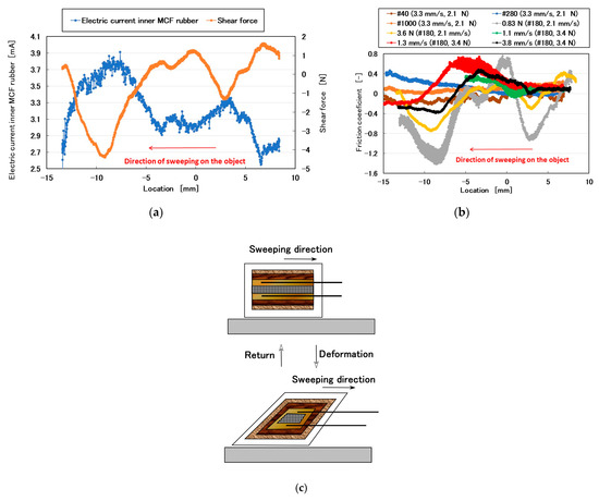 To ensure that the obtained lines in Figure 3 correctly represented shear force, we adopted #180 sandpaper with a 2.1-mm/s sweeping velocity and 3.7-N normal force, and then compared the electric current with the shear force measured using a load cell (Figure 4a). By considering that the electric pole of the electric current was reversed to that of the shear force, a quantitative changing tendency was coincident to both of them. Therefore, the electric current characteristics on the shear force were reactions to the convex and concave shapes of the object. Subsequently, the friction coefficient calculated by dividing the measured shear by the normal forces characterized the surface roughness of the object (Figure 4b). The change in the friction coefficient was non-linear overall, although a constant existed depending on the experimental conditions, such as in for #40, #280, and #1000 sandpapers. The non-linearity was due to the repeated deformation and restoration of the multi-layered MCF rubber sensor by the force created between the layers under shear motion (Figure 4c).