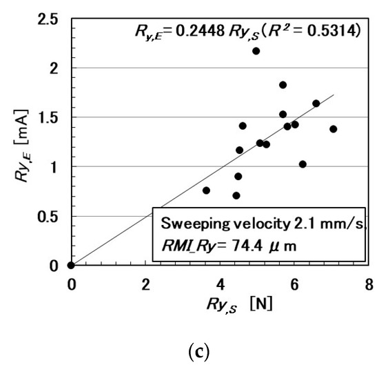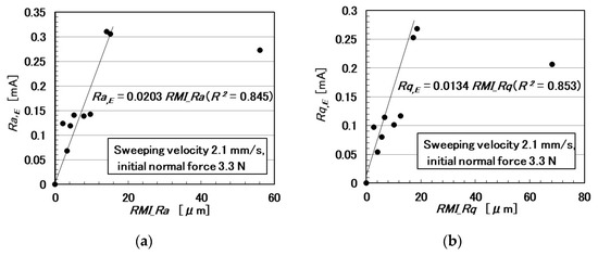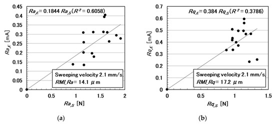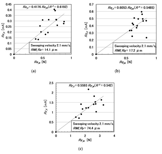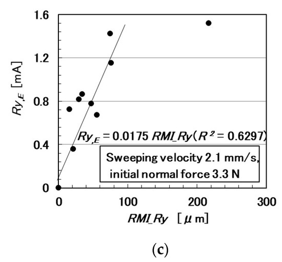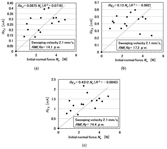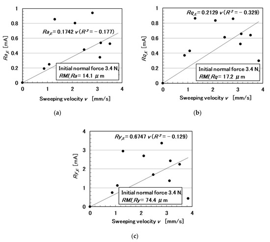 In the following paragraphs, we investigate the electric current affected by three parameters: the surface roughness of the rubbed object, sweeping velocity, and normal force. From the observation that the electric current corresponds to the shear force (Figure 4), the electric current can be evaluated using the same ordinary arithmetic values on the roughness curve measured using ordinary surface-roughness-measuring devices such as SJ-400: Ra, Rq, and Ry. Therefore, with respect to the electric current, Ra,E, Rq,E, and Ry,E, which corresponds to Ra, Rq, and Ry, are calculated. These are affected by the surface roughness of the object (RMI_Ra, RMI_Rq, and RMI_Ry), sweeping velocity (v), initial normal force (No) (which is the normal force before sweeping), as well as by Ra,N, Rq,N, and Ry,N, which are evaluated on the normal force and correspond to Ra, Rq, and Ry, and by Ra,S, Rq,S, and Ry,S, which are evaluated on the shear force and correspond to Ra, Rq, and Ry.