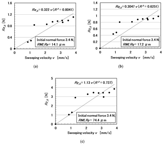 Relationship between shear force and sweeping velocity: (a) Ra.; (b) Rq.; and (c) Ry.