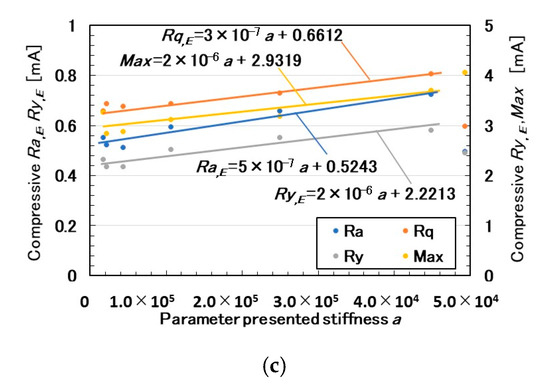Results of the silicone gel in contact with the MCF rubber sensor under compression: (a) electric current and pressure with a ratio of involving thinner to KE1300T at 1.5; (b) relationship between pressure and compressive shear rate at various ratios of the thinner to KE1300T; (c) relationship of Ra,E, Rq,E, Ry,E, and Max to the parameter presented stiffness a.