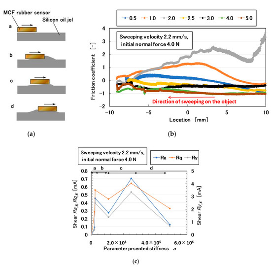 In contrast, when the softness of a soft object such as the silicone gel is measured, it is pushed and its elasticity measured, as discussed in the previous section using the NFE. In general, the relationship between normal and shear motions has not been conducted on a soft object before. Therefore, we investigated the relationship between the elasticity and the friction coefficient of the silicone gel. The former is denoted by the parameter a and the latter by the electric current of the MCF rubber sensor. Ra,E, Rq,E, and Ry,E denote the friction coefficients and thus the elasticity and friction coefficient are related (Figure 14c). The indexes a, b, c, and d in Figure 14c correspond to a, b, c, and d in Figure 14a respectively. Ra,E, Rq,E, and Ry,E exhibit two predominant peaks, which correspond to b and d in Figure 14a.