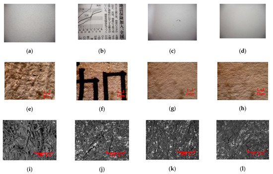 Images of various papers rubbed by the MCF rubber sensor: (a) toilet paper; (b) newspaper; (c) high-quality printing paper; (d) recycled printing paper; (e) and (i) microscopic image of A; (f) and (j) microscopic image of B; (g) and (k) microscopic image of C; (h) and (l) microscopic image of D; (e)–(h) by optical microscope, (i)–(l) by scanning electron microscope (SEM) with 150 magnification.