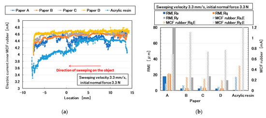 Results of paper by the MCF rubber sensor under shear motion: (a) electric current; (b) Ra,E, Rq,E, Ry,E of (a), RMI_Ra, RMI_Rq, and RMI_Ry of paper.