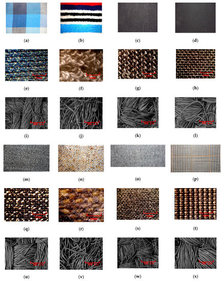 Images of various cloths rubbed by the MCF rubber sensor: (a) handkerchief; (b) washcloth; (c) cloth of trousers; (d) jacket for women; (e) and (i) microscopic image of A; (f) and (j) microscopic image of B; (g) and (k) microscopic image of C; (h) and (l) microscopic image of D; (m) E cloth of jacket for men; (n) F cloth of business suit for men in the winter; (o) G cloth of trousers for women; (p) H cloth of business suit for men in the summer; (q) and (u) microscopic image of E; (r) and (v) microscopic image of F; (s) and (w) microscopic image of G; (t) and (x) microscopic image of H; (e)–(h) and (q)–(f) by optical microscope; (i)–(l) and (u)–(x) by SEM with 150 magnification.