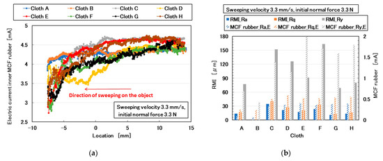 Results of cloth by the MCF rubber sensor under shear motion: (a) electric current; (b) Ra,E, Rq,E, Ry,E of (a), RMI_Ra, RMI_Rq, and RMI_Ry of cloth.
