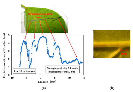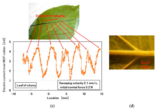 Subsequently, we investigated a comparatively rough-surface, convexo-concave body. We attempted the test on the back surfaces of hydrangea and cherry leaves (Figure 19). The MCF rubber sensor was rubbed along the surface of the leaf using the same SFE instrument and measuring method described in the previous section. By crossing the leaf veins as shown in Figure 19b,d, the MCF rubber sensor captures their convexo-concave shapes using the electric current of the MCF rubber sensor as piezo-resistivity (Figure 19a,c).