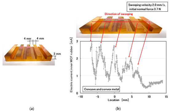 Additionally, we investigated the surface roughness of a large convexo-concave body, which was a metal body fabricated from brass (Figure 20). The height of the convexo-concave body in Figure 20a was significantly larger than those of Figure 19b,d. The MCF rubber sensor was rubbed along the surface of the body using the same SFE instrument and measuring method described in the previous section. By crossing the body, the MCF rubber sensor captured its convexo-concave shape using the electric current of the MCF rubber sensor as piezo-resistivity (Figure 20b).