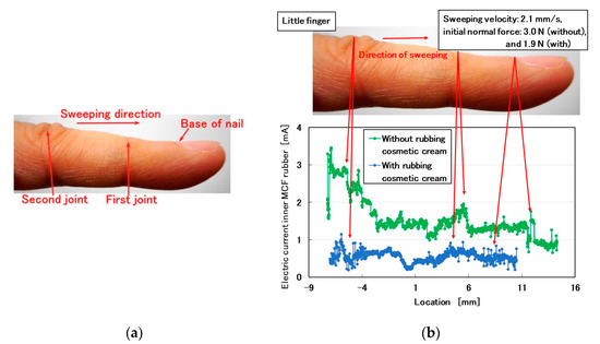 In case of rubbing little finger by the MCF rubber sensor: (a) image of the little finger and sweeping direction; (b) surface roughness of little finger coated with and without cosmetic cream.
