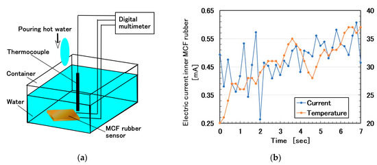 As Figure 22a shows, we measured the electric current as the piezo-resistivity of the MCF rubber sensor immersed in water into which hot water was poured. The MCF rubber sensor and measurement method were the same as described in the previous section. We simultaneously measured the temperature adjacent to the MCF rubber sensor using a thermocouple. Figure 22b shows the change in the electric current as a function of water temperature. At the initiative period of less than approximately 2 s, the electric current was independent of the increase in water temperature because of the buffer of the outer shell of the Q rubber coat around the MCF rubber sensor. Subsequently, the electric current changed according to the increase in water temperature, which indicated a good agreement.